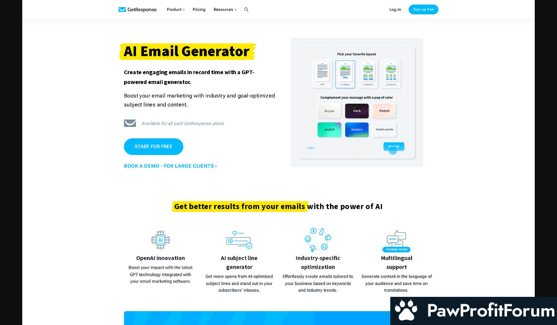 Specify your email goals, select the tone and design direction, and generate a complete email template. You can also do A/B test emails for optimization and creative brainstorming based on identified industry trends. The AI Email Generator is available with all paid GetResponse plans and will soon offer multilingual support.