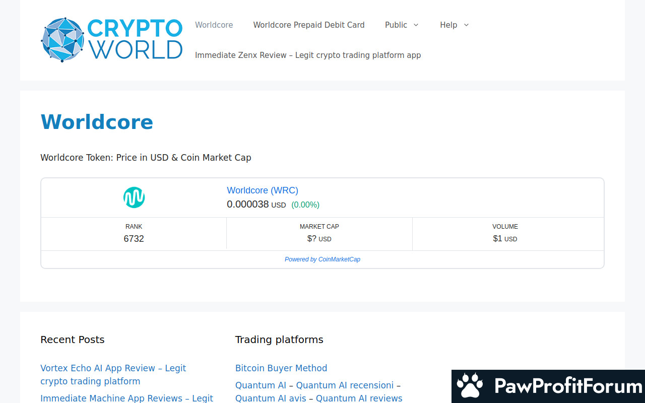 Worldcore (WRC) is a cryptocurrency token and operates on the Ethereum platform. Worldcore has a current supply of 245,209,299 with 178,103,291 in circulation. The last known price of Worldcore is 0.00038996 USD and is up 3.11 over the last 24 hours. It is currently trading on 2 active market(s) with $0.00 traded over the last 24 hours. More information can be found at https://worldcore.eu.