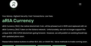 aRIA Currency (RIA) will be transitioning from a Native Blockchain Coin running on its own network to a Solana Network based Token. RIA the Token will use the same name as the Coin after the transistion. Roadmaps and updates to be provided after release of the Token.