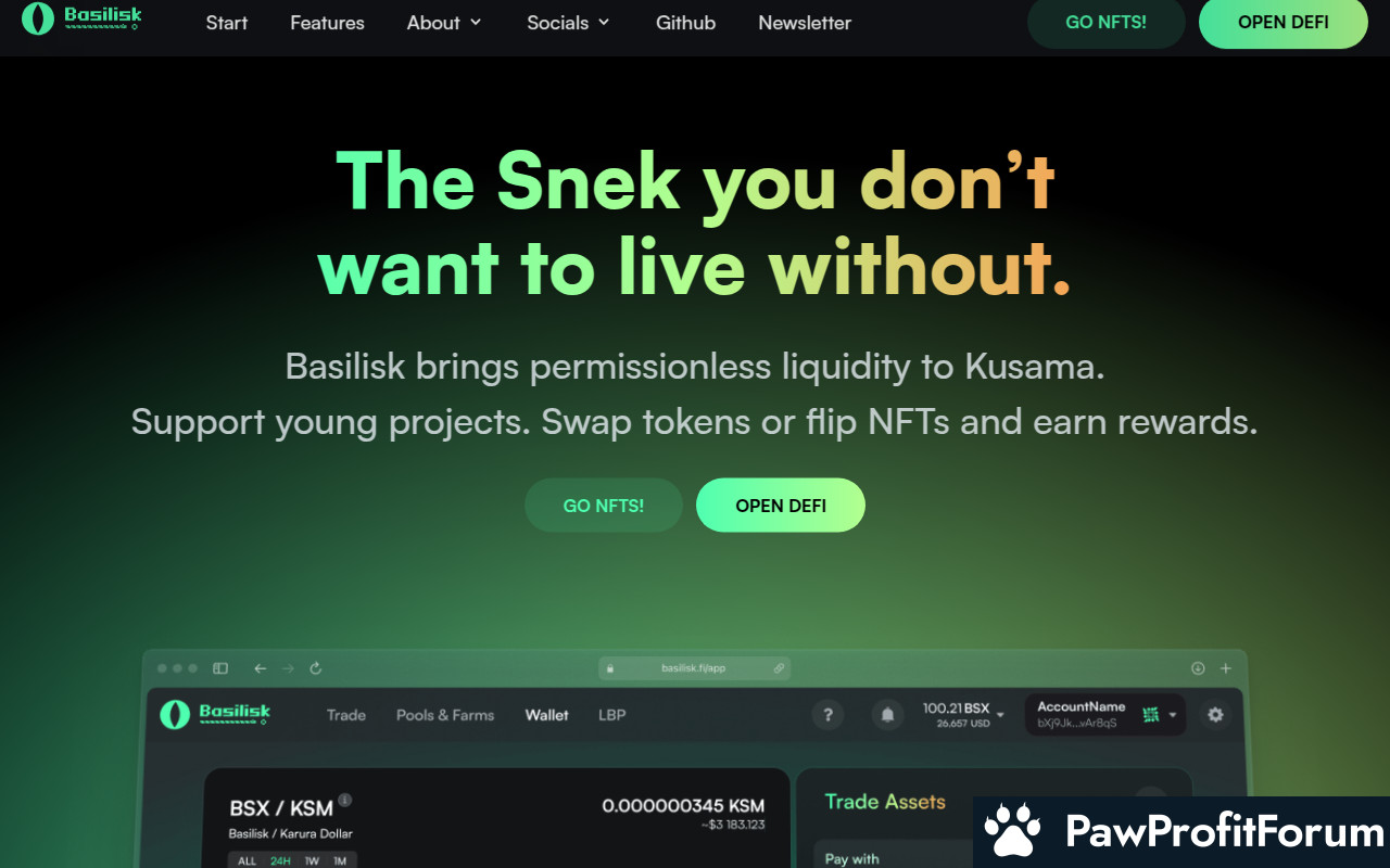 Basilisk's ecosystem is rich with features aimed at enhancing the user experience and providing value to the community. Among these features are Snek Swap, a platform for the exchange of tokens; Snek LBP (Liquidity Bootstrapping Pool), which supports the growth of nascent projects; Snek Farms, a mechanism for users to earn rewards; and an NFT Marketplace, facilitating the buying and selling of non-fungible tokens. These components are integral to Basilisk's mission of supporting crypto assets throughout their lifecycle.