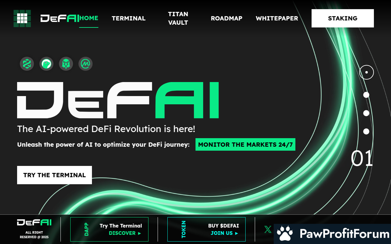 DeFAI is a next-generation decentralized finance (DeFi) platform that leverages Artificial Intelligence (AI) to simplify and enhance the DeFi experience. It combines AI agents with DeFi protocols to offer intelligent portfolio management, data-driven investment strategies, and seamless multi-chain asset aggregation. DeFAI addresses the complexities of managing multiple DeFi platforms by providing a unified interface for users to track, manage, and grow their assets effortlessly. With products such as DeFAI Agent, the platform integrates AI capabilities to automate tasks, provide personalized insights, and ensure users remain updated on key developments across their portfolios. DeFAI focuses on scalability, low transaction fees, and community-centric governance through its native token, $DEFAI