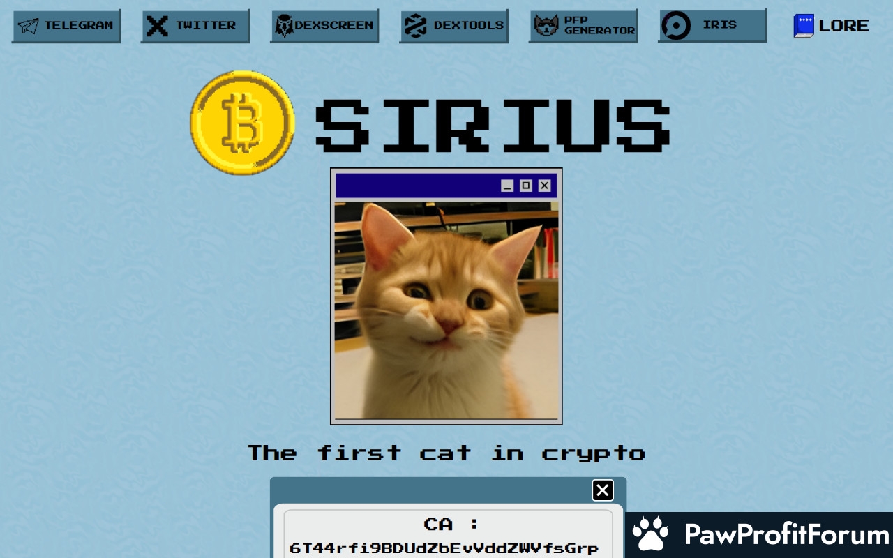 Sirius is a meme token dedicated to the first cat to crypto connection. The cat photo is the one that Martti Malmi, a Bitcoin co-developer, used as his profile photo on bitcointalk.org.