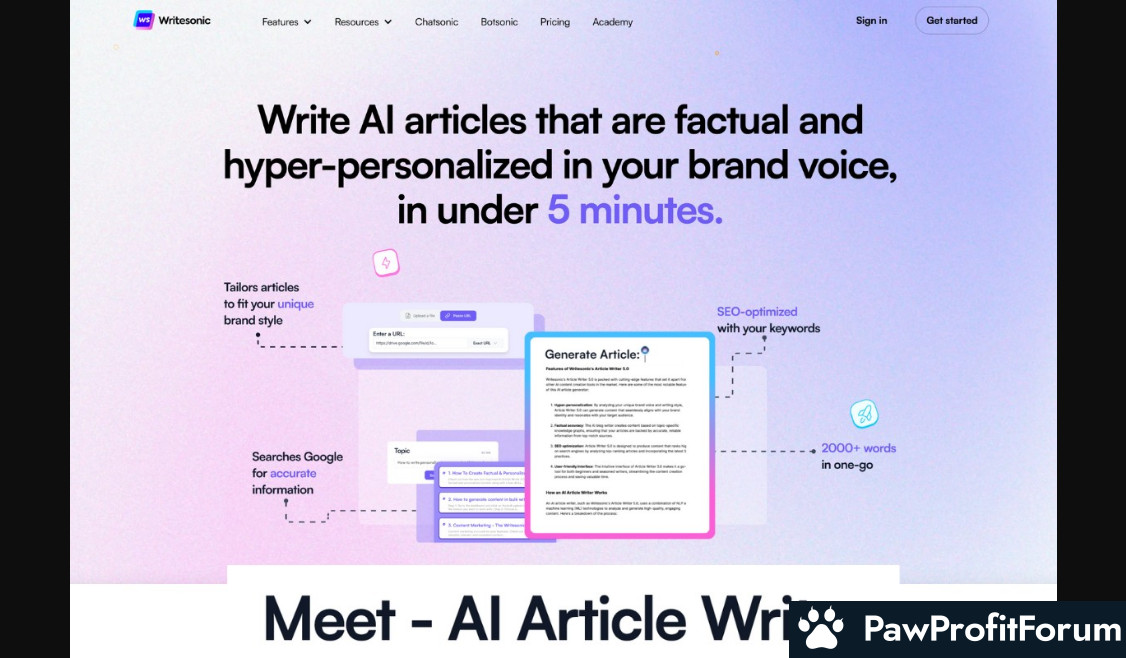 - Brand Voice Replication: The WriteSonic AI Writer writes your content. You can train it to mimic your brand's tone, structure, and guidelines by uploading PDFs, linking articles, or even copy/pasting. Get comprehensive coverage by uploading your proprietary documents.
